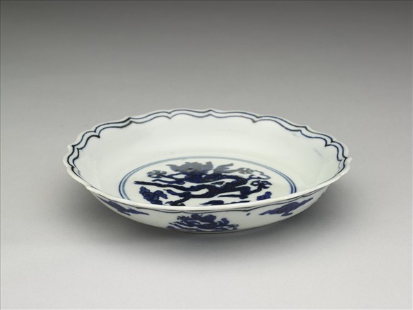 八瓣蓮花口,淺壁,矮圈足。薄胎白釉,盤心與外壁分畫青雲龍六條,口足內外加飾青線八道。底有青花書「大明嘉靖年製」六楷字款,外加雙圈。