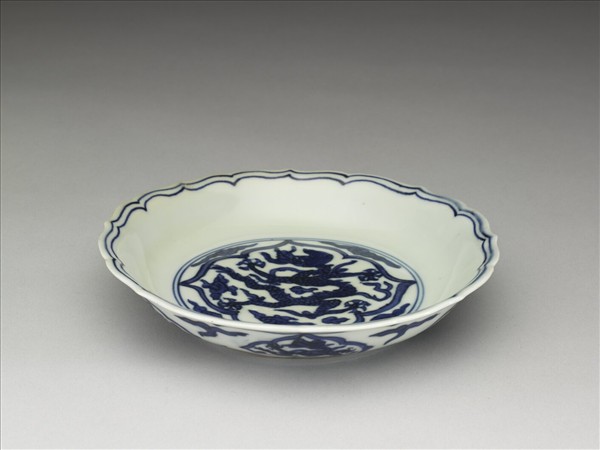 八瓣蓮花口,淺壁,矮圈足。薄胎白釉,盤心與外壁分畫青雲龍六條,口足內外加飾青線八道。底有青花書「大明嘉靖年製」六楷字款,外加雙圈。