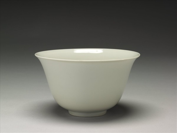 侈口窄唇,深壁,矮圈足。薄胎骨,通體甜白釉,樸素無紋。底有青花書「大明嘉靖年製」六楷字款,外加雙圈。