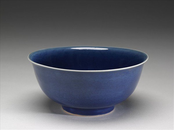 侈口窄唇,深壁,矮圈足。碗心與外壁淺劃雲龍三條,外壁滿劃雲紋。胎骨稍厚,通體深青色釉。底有「大明嘉靖年製」陰刻楷字款,外加雙圈。