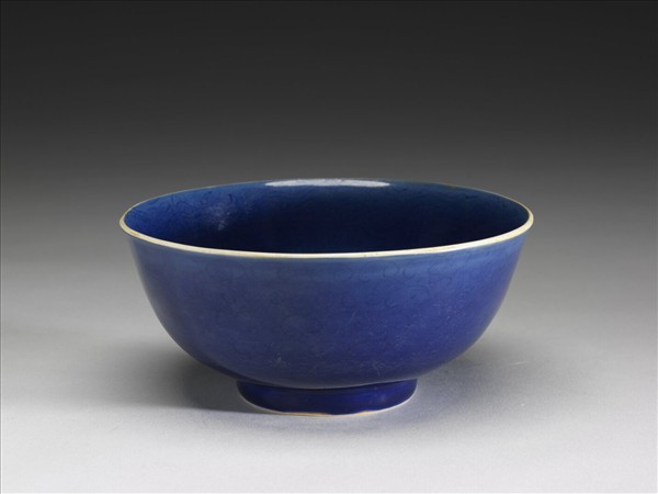 侈口窄唇,深壁,矮圈足。碗心與外壁淺劃雲龍三條,外壁滿劃雲紋。胎骨稍厚,通體深青色釉。底有「大明嘉靖年製」陰刻楷字款,外加雙圈。