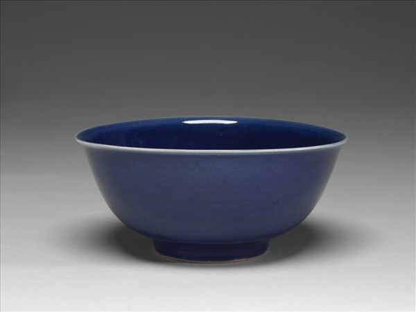 侈口窄唇,深壁,矮圈足。碗心與外壁淺劃雲龍三條,外壁滿劃雲紋。胎骨稍厚,通體深青色釉。底有「大明嘉靖年製」陰刻楷字款,外加雙圈。