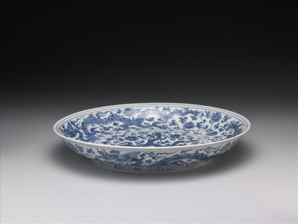 侈口斂腹,淺弧壁,整器以青花繪飾番蓮紋為地,五龍遨遊期間,其中二龍位於器外壁,另三龍則於器內。器內三龍之配置,乃以一龍居盤心,另兩龍則繞圍於盤沿。圈足內書「正德年製」四字楷款,款外以雙圈圍住。