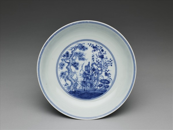 侈口窄唇,淺壁,矮圈足。盤心畫松、竹、梅三友,加飾湖石、靈芝,周壁純白無紋飾。外壁畫庭園景物,二童嬉戲其間,婦人坐於一旁。內外分飾青線十道。底有青花書「大明嘉靖年製」六楷字款,外加雙圈。