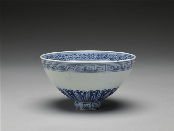 口部微外侈、弧形壁、上豐下斂、尖底,並帶矮圈足,因貌似蓮房,所以稱為蓮子碗。以青花為飾,外壁近底處繪變形蕉葉紋,碗心則繪以精彩紛呈的幾何形式花朵。口沿處內外的邊飾為回紋與古錢紋。足圈畫回紋一周,青線三道。底有青花書「大明宣德年製」六楷字款。