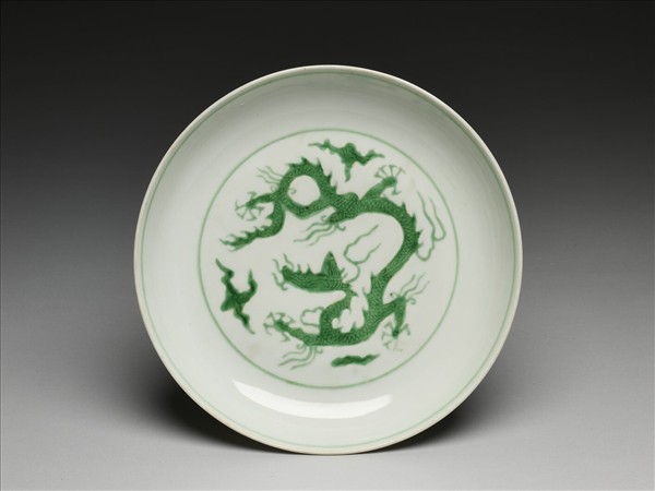 侈口,淺壁弧形,矮圈足。盤心與外壁刻畫雲龍三條,外壁隙地淺劃雙珠、波濤紋。薄胎白釉,龍紋加填綠彩,口足內外分畫綠線四道。底有青花書「大明正德年製」二行六字楷款,外加雙圈。