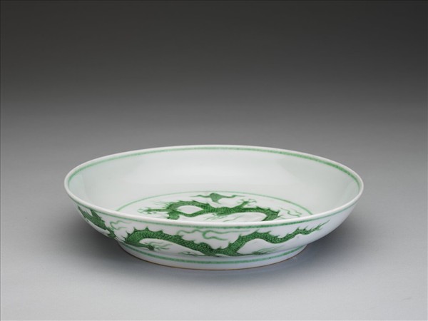 侈口,淺壁弧形,矮圈足。盤心與外壁刻畫雲龍三條,外壁隙地淺劃雙珠、波濤紋。薄胎白釉,龍紋加填綠彩,口足內外分畫綠線四道。底有青花書「大明正德年製」二行六字楷款,外加雙圈。