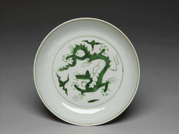 侈口,淺壁弧形,矮圈足。盤心與外壁刻畫雲龍三條,外壁隙地淺劃雙珠、波濤紋。薄胎白釉,龍紋加填綠彩,口足內外分畫綠線四道。底有青花書「大明正德年製」二行六字楷款,外加雙圈。