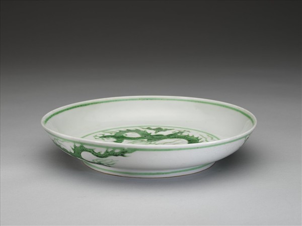 侈口,淺壁弧形,矮圈足。盤心與外壁刻畫雲龍三條,外壁隙地淺劃雙珠、波濤紋。薄胎白釉,龍紋加填綠彩,口足內外分畫綠線四道。底有青花書「大明正德年製」二行六字楷款,外加雙圈。