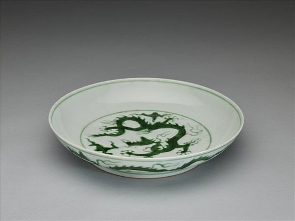 侈口,淺壁弧形,矮圈足。盤心與外壁刻畫雲龍三條,外壁隙地淺劃雙珠、波濤紋。薄胎白釉,龍紋加填綠彩,口足內外分畫綠線四道。底有青花書「大明正德年製」二行六字楷款,外加雙圈。