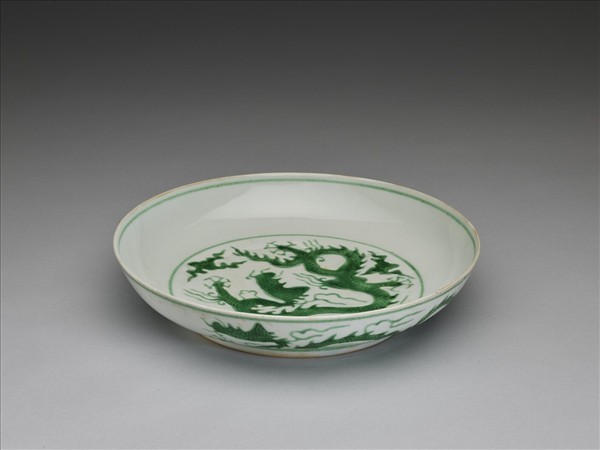 侈口,淺壁弧形,矮圈足。盤心與外壁刻畫雲龍三條,外壁隙地淺劃雙珠、波濤紋。薄胎白釉,龍紋加填綠彩,口足內外分畫綠線四道。底有青花書「大明正德年製」二行六字楷款,外加雙圈。