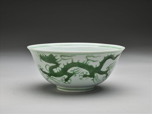 侈口窄唇,深壁,矮圈足。碗心與外壁飾龍紋三條,外壁隙地淺劃波濤、山石,內壁樸素無紋飾。薄胎白釉,龍紋加填綠彩,內外分飾綠線四道。底有青花書「大明正德年製」六楷字款,外加雙圈。