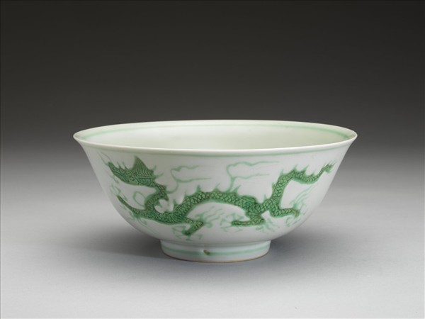 侈口窄唇,深壁,矮圈足。碗心與外壁飾龍紋三條,外壁隙地淺劃波濤、山石,內壁樸素無紋飾。薄胎白釉,龍紋加填綠彩,內外分飾綠線四道。底有青花書「大明正德年製」六楷字款,外加雙圈。