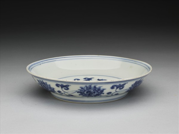 侈口窄唇,淺壁,矮圈足。薄胎白釉,盤心畫青番蓮一枝,外壁畫轉枝番蓮七朵。口足內外加飾青線九道。底有青花書「正德年製」四楷字款,外加雙圈。