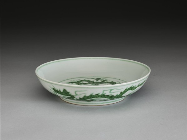 侈口窄唇,淺壁,矮圈足。盤心與外壁飾雲龍三條,外壁隙地淺劃波濤紋。薄胎白釉,龍紋加填綠彩,口足內外分畫綠線四道。底有青花書「大明正德年製」六楷字款,外加雙圈。