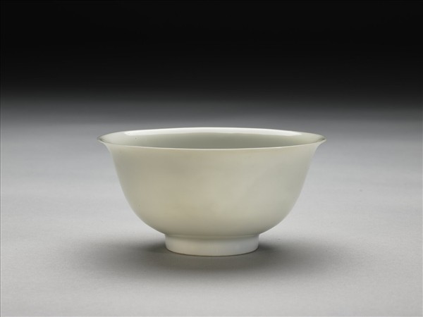 侈口窄唇,深壁,矮圈足。內壁錐拱雙龍紋。半脫胎,甜白釉,龍紋外壁可見。碗心劃有「永樂年製」四篆字暗款,外加單圈。