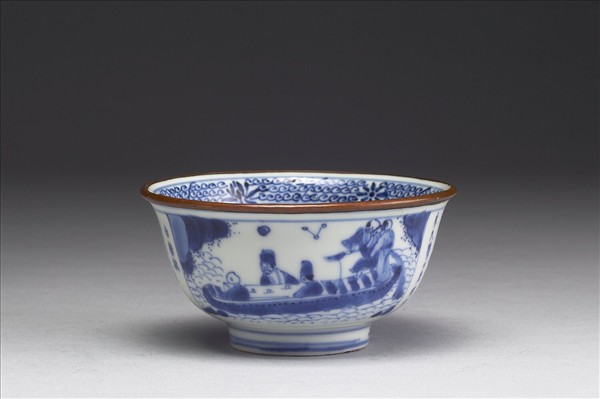 撇口茶鍾造型,口沿或有縮釉疵點,鑲嵌銅邊一道;矮圈足,足底呈斜削玉璧形,足牆外高內低,較一般圈足寬厚,底及圈足均見鏇坯遺痕,露胎處細白無釉,胎體厚重。外壁一面青花繪蘇東坡與友人乘舟遊赤壁圖;另面則書〈後赤壁賦〉詩文,內底心青花書「永樂年製」二行四字偽托篆款。 茶鍾形制類似明初永樂造型的壓手杯,明代以至清末,民窯茶杯中不斷被沿襲製作,萬曆年間亦製作不少,只是到了晚清因應工夫茶器或外銷日本煎茶道的使用,尺寸比原明代茶鍾縮小。而胎體厚重應也是為了保持茶溫及茶香的實用功能而作。此對茶鍾(故瓷002713、故瓷002714)在《點查報告》中名稱為「青詩意鑲銅口茶鍾二件」,應為清宮所訂,「青」即青花之意,「詩意」為清宮對附加詩文器物的稱法。 明晚期多量書有「永樂年製」篆書款的民窯瓷器大量外銷,這類帶款璧形足的大小青花茶鍾亦多見於中國各地,如江西、四川、閩粵等地。