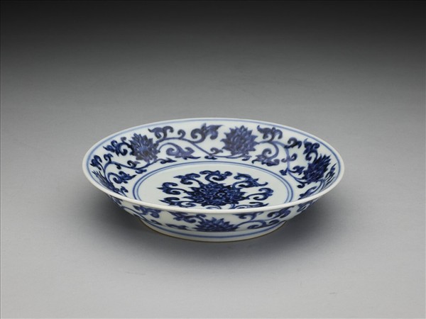 侈口窄唇,淺弧形壁,矮圈足。內、外壁各畫纏枝番蓮六朵,盤心畫一折枝番蓮,內外花紋間加飾青線六道。底有青花書「大明宣德年製」二行六字楷款,外加雙圈。