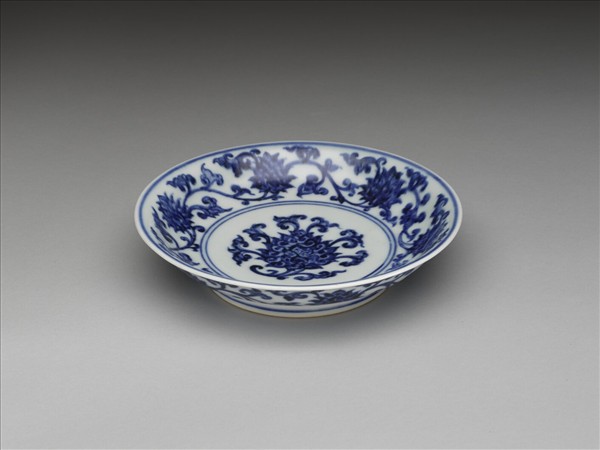 侈口窄唇,淺弧形壁,矮圈足。內、外壁各畫纏枝番蓮六朵,盤心畫一折枝番蓮,內外花紋間加飾青線六道。底有青花書「大明宣德年製」二行六字楷款,外加雙圈。