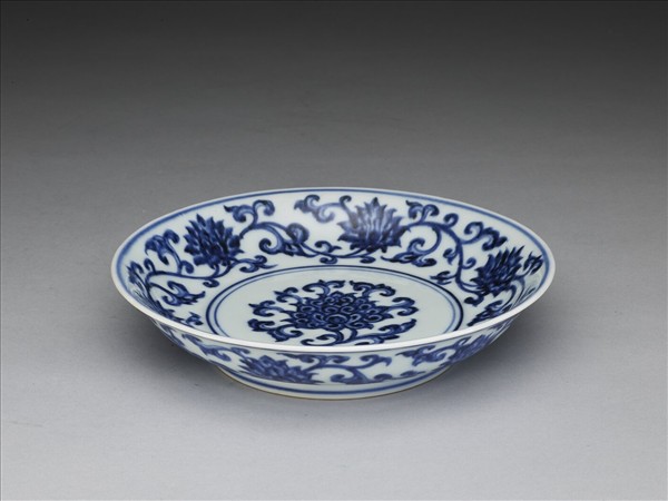 侈口窄唇,淺弧形壁,矮圈足。內、外壁各畫纏枝番蓮六朵,盤心畫一折枝番蓮,內外花紋間加飾青線六道。底有青花書「大明宣德年製」二行六字楷款,外加雙圈。