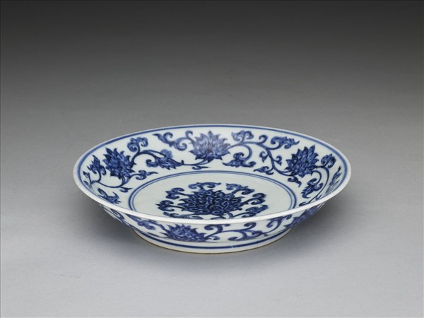 侈口窄唇,淺弧形壁,矮圈足。內、外壁各畫纏枝番蓮六朵,盤心畫一折枝番蓮,內外花紋間加飾青線六道。底有青花書「大明宣德年製」二行六字楷款,外加雙圈。