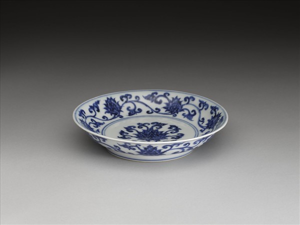 侈口窄唇,淺弧形壁,矮圈足。內、外壁各畫纏枝番蓮六朵,盤心畫一折枝番蓮,內外花紋間加飾青線六道。底有青花書「大明宣德年製」二行六字楷款,外加雙圈。