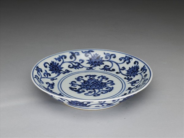侈口窄唇,淺弧形壁,矮圈足。內、外壁各畫纏枝番蓮六朵,盤心畫一折枝番蓮,內外花紋間加飾青線六道。底有青花書「大明宣德年製」二行六字楷款,外加雙圈。