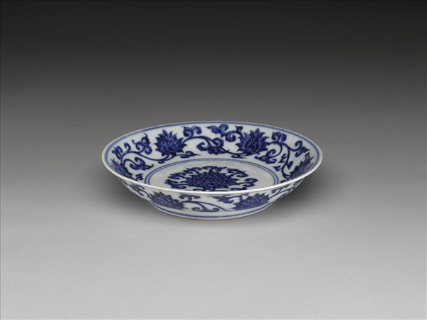 侈口窄唇,淺弧形壁,矮圈足。內、外壁各畫纏枝番蓮六朵,盤心畫一折枝番蓮,內外花紋間加飾青線六道。底有青花書「大明宣德年製」二行六字楷款,外加雙圈。