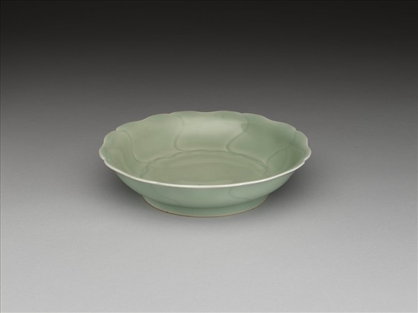 八瓣葵花形,侈口,淺壁,矮圈足。胎質較厚,釉色仿龍泉。底有青花書「大明宣德年製」六楷字款,外加雙圈。