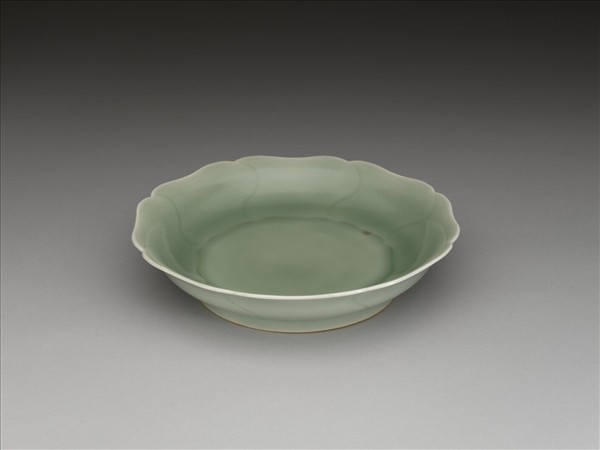 八瓣葵花形,侈口,淺壁,矮圈足。胎質較厚,釉色仿龍泉。底有青花書「大明宣德年製」六楷字款,外加雙圈。