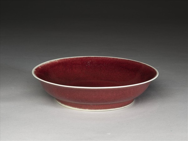 侈口窄唇,淺壁,矮圈足。胎質稍厚,內外滿施鮮紅釉,盤底純白,口足均露白邊,樸素無紋飾。底劃有「大明宣德年製」六楷字暗款,外加雙圈。