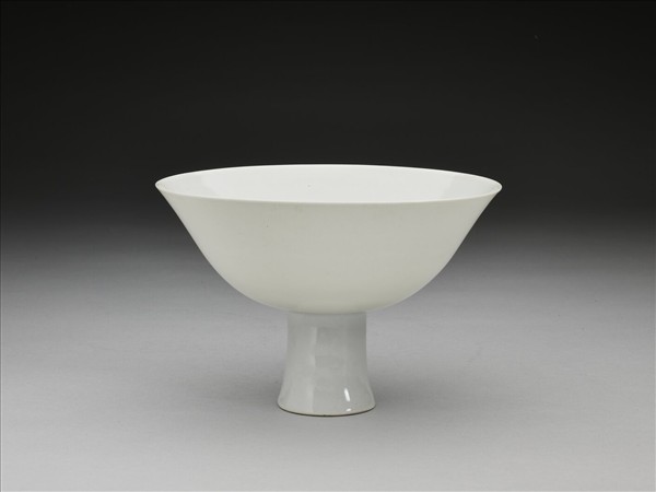 侈口窄唇,深壁,高圈足。碗壁半脫胎,足圈較厚,通體甜白釉,樸素無紋飾。碗心有青花書「大明宣德年製」六楷字款,外加單圈。