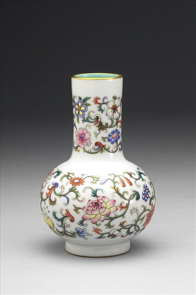 直口,長頸,圓腹,圈足,清宮稱這類頸略寬長的瓶制為紙槌瓶。瓶通體白釉,分二段裝飾,器頸及圓腹各彩繪番蓮、銀蓮花、洋菊等西洋花卉,口沿、足底描金。胎薄體輕,底部及內頸施湖綠釉,底心留白框內青花書「大清乾隆年製」六字三行篆款。