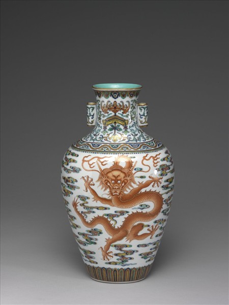 撇口扁瓶,束頸,雙貫耳,斜肩,斂腹,淺圈足。器內壁施湖綠釉。口緣、貫耳上下緣皆塗金邊。口緣下方畫一周如意雲頭紋,頸部雙面均飾蝙蝠啣磬圖案,兩側各飾綠、藍色螭龍紋。肩部一周寬帶紋,內畫上下交錯的雲紋圖案,帶紋下方飾一排圈點紋。腹壁兩面均飾紅色團龍圖案,外圍五彩祥雲。腹底飾一周仰蓮瓣紋。足緣無釉露胎,外底施湖綠釉,並留白框書「大清乾隆年製」青花篆書款。根據目前考古資料顯示,釉下青花與釉上彩相互結合的技法可上溯至明宣德時期,而盛燒於明成化年間。「鬥彩」是先燒成釉下青花後,於釉上加繪各種彩料,再入窯第二次以低溫燒製而成。《南窯筆記》的作者認為,凡是釉下青花和釉上彩色結合成完整圖案者,稱為「鬥彩」。