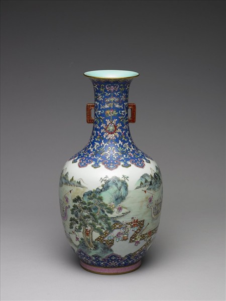 撇口,長頸兩側各帶方形耳,斜肩,長碩腹,矮圈足。器內壁與外底施淺藍色釉,足底緣無釉露胎,外底中心以紅彩書「大清嘉慶年製」篆款。口緣塗一道金邊,頸部以藍釉為地,下緣呈如意雲頭形狀。釉面繪飾蝙蝠啣磬圖案,下方飾雙魚與番蓮花。兩耳於暗紅釉上畫金彩回紋。腹壁以白釉為地,繪飾孩童於江面上舉行龍舟競賽的情景,岸邊童子或燃放鞭炮,或敲鑼打鼓,場面熱鬧非凡。腹底為藍釉地,並彩繪朵花紋。圈足外壁於粉紅釉上畫紅色回紋。此器屬清宮「磁胎洋彩」,但自民國初期以來常被稱為「粉彩」。