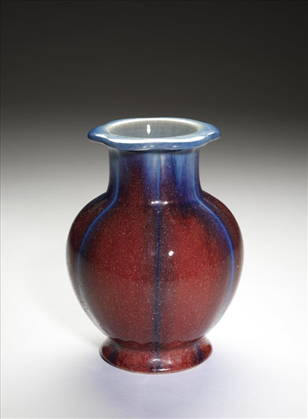 六瓣花形口,短頸,碩腹六瓣,矮圈足。胎骨厚重,天藍色釉,窯變紫紅色,器內淺藍,底釉黃褐。底印有「大清乾隆年製」六篆字款。