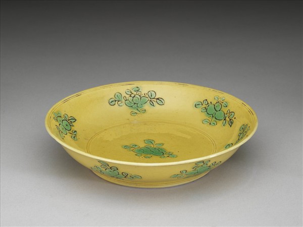 侈口窄唇,淺壁,矮圈足。盤心雕刻牡丹花一枝,內外壁各刻花、果六枝,加飾淺線四道。薄胎黃釉,花果均加填綠彩。底有青花書「大明嘉靖年製」六楷字款,外加雙圈。
