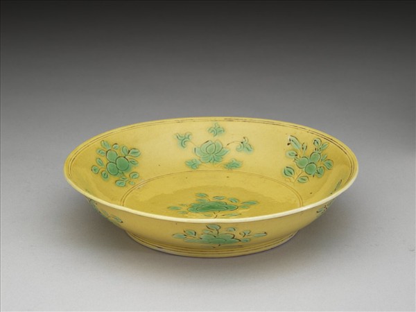 侈口窄唇,淺壁,矮圈足。盤心雕刻牡丹花一枝,內外壁各刻花、果六枝,加飾淺線四道。薄胎黃釉,花果均加填綠彩。底有青花書「大明嘉靖年製」六楷字款,外加雙圈。
