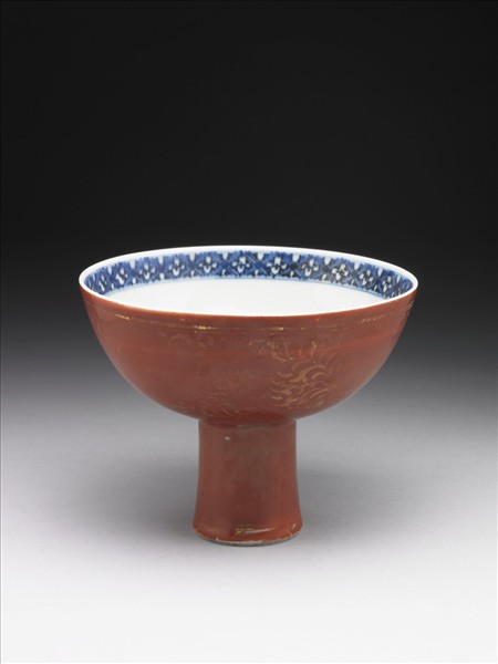 侈圓口,淺弧壁,高足中空,圈足底部微撇。器之外壁與高足滿施紅釉,器外壁並以金彩繪飾花卉紋,枝葉曲繞滿布,近足處有一圈蓮瓣紋。碗內圓形開光中則以青花繪飾石榴兩枝相對。
