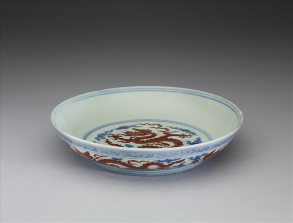 侈口,淺壁,矮圈足。薄胎白釉,外壁畫青花波濤紋,加繪紅龍九條。口飾錢紋一周,足飾青線二道。盤底心畫青花波濤紋,加繪紅龍一條,口沿及底飾青線三道,周壁純白無紋飾。