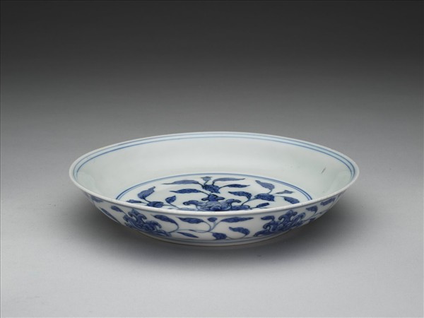 侈口窄唇,淺壁,矮圈足。薄胎白釉。盤心畫番蓮花一枝,外壁畫轉枝番蓮六朵,口足內外分飾青線九道。內壁純白,樸素無紋飾。