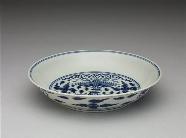 侈口,淺壁,矮圈足。薄胎白釉,盤心及外壁均畫青花鳳凰一對,隙地加飾朵雲,內外分飾青線七道。內壁純白無紋飾。底有青花書「大清嘉慶年製」六篆字款。