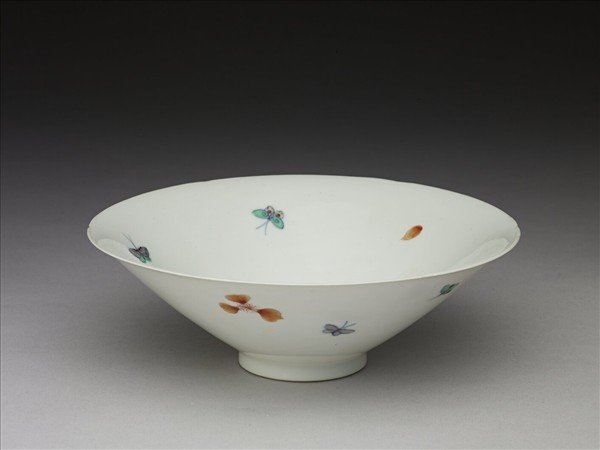 均六瓣葵花口,深壁,矮圈足。器內外均畫有淡紅梅瓣,飾以彩蝶數隻。半脫胎,甜白釉,花蝶表裏可互見。底均有青花書「大明成化年製」六楷字款,外加雙圈。