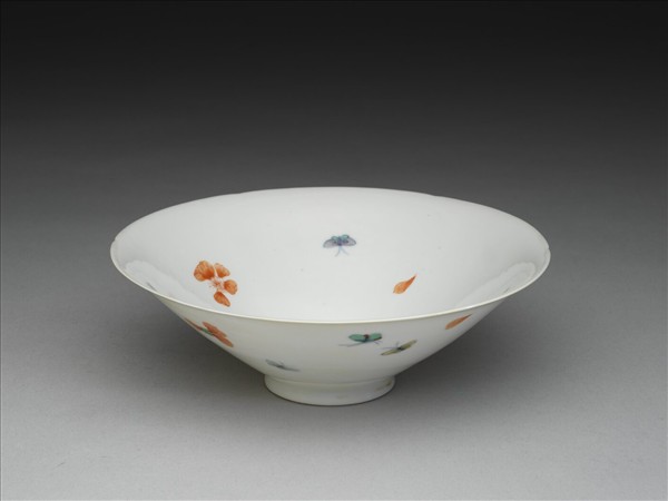 均六瓣葵花口,深壁,矮圈足。器內外均畫有淡紅梅瓣,飾以彩蝶數隻。半脫胎,甜白釉,花蝶表裏可互見。底均有青花書「大明成化年製」六楷字款,外加雙圈。