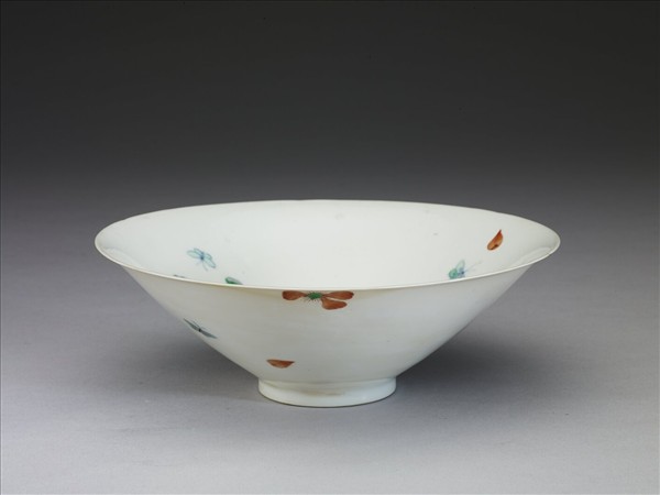 均六瓣葵花口,深壁,矮圈足。器內外均畫有淡紅梅瓣,飾以彩蝶數隻。半脫胎,甜白釉,花蝶表裏可互見。底均有青花書「大明成化年製」六楷字款,外加雙圈。