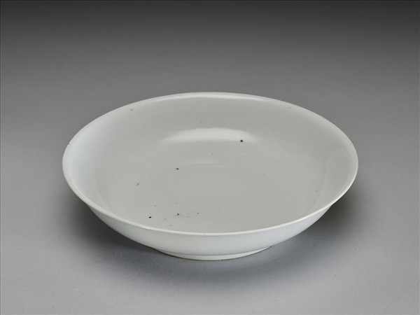 敞口,口沿外撇,淺壁,矮圈足。胎質較薄,器內外壁滿施白釉,盤底純白,樸素無紋飾,圈足露胎。