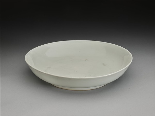 侈口,淺壁弧形,矮圈足。胎質較薄,通體甜白釉,樸素無紋飾。底有青花書「大明成化年製」六楷字款,外加雙圈。