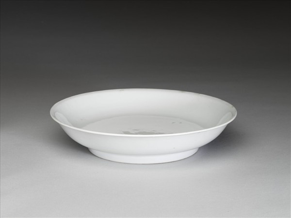 敞口,口沿外撇,淺壁,矮圈足。胎質較薄,器內外壁滿施白釉,盤底純白,樸素無紋飾,圈足露胎。