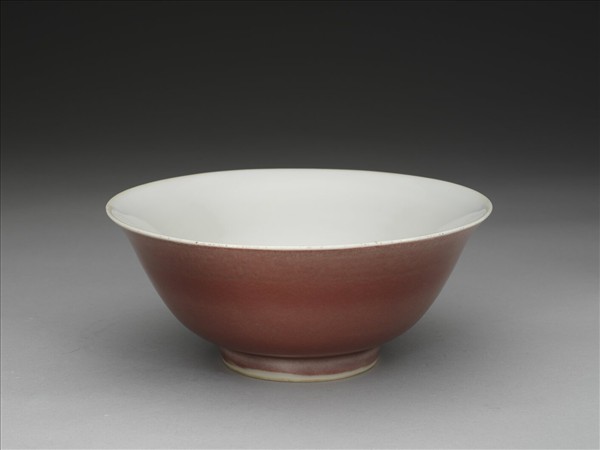 侈口,深壁,矮圈足。胎質較薄,外面滿施鮮紅釉,椶眼密佈如橘皮。內面純白,樸素無紋飾。底有青花書「正德年製」四楷字款,外加雙圈。
