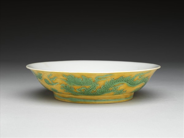 侈口窄唇,淺壁,矮圈足。胎骨較薄。外壁嬌黃釉地,錐拱雙雲龍戲珠紋,加填綠彩。足圈飾綠線一道。內面純白釉,樸素無紋飾。底有青花書「正德年製」四楷字款,外加雙圈。